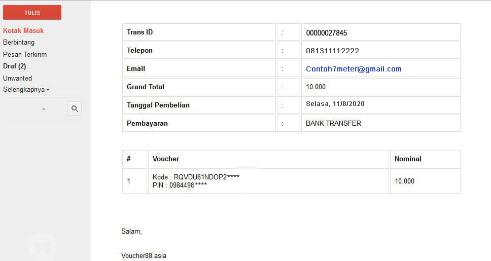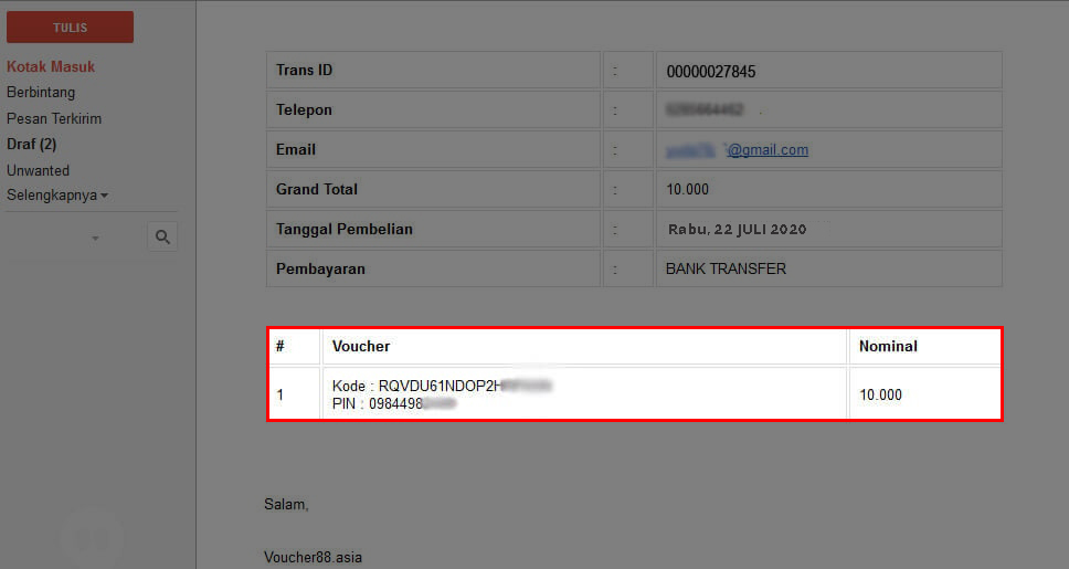 Maka anda akan mendapatkan Kode Voucher di Email yang telah terdaftar di akun anda.