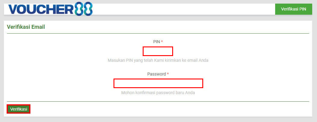 5. Silahkan Anda Masukan PIN yang dikirimkan ke Email Anda dan Masukan Kembali Password Anda, Lalu Klik VERIFIKASI