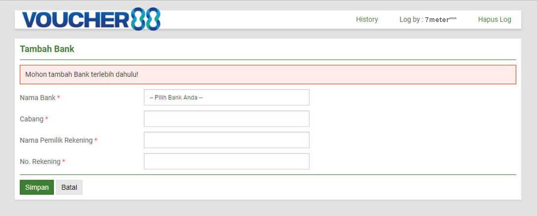 PENTING : Harap di perhatikan bahwa Voucher88 akan kami proses jika, Anda mengirimkan uang dari Nama Rekening yang anda daftarkan. Kami tidak menerima pengiriman uang dari nama yang berbeda yang ada di akun anda.